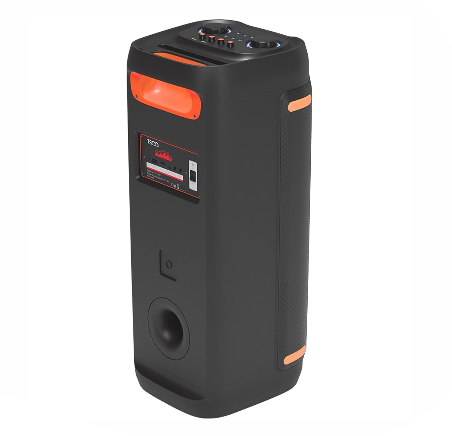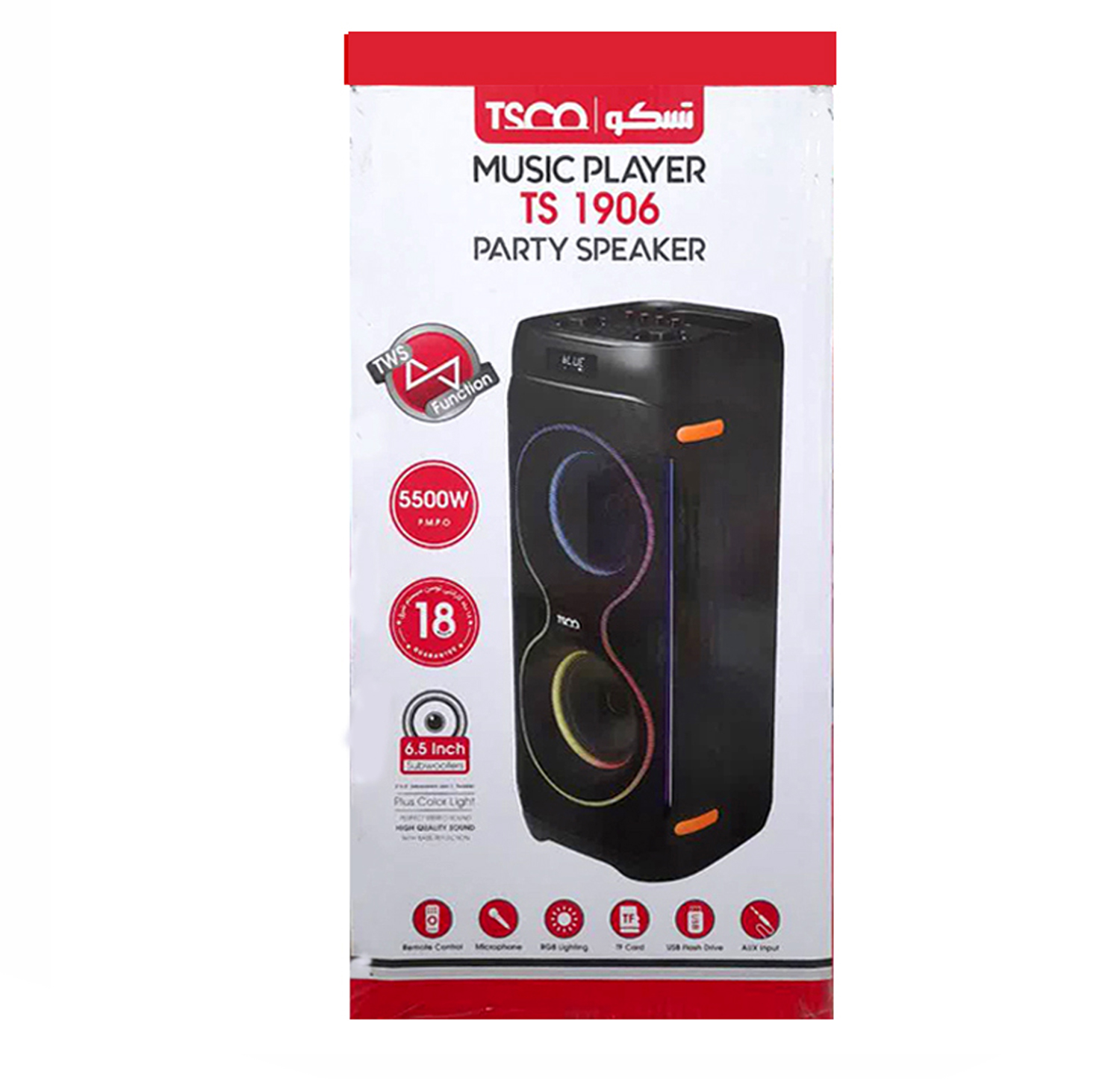 در قلب عملکرد صوتی TS 1906، یک سیستم تقویتکننده با توان محیطی 5500W و توان واقی 40 وات (RMS) دارد. دو ووفر 6.5 اینچی و یک تیوتر 3 اینچی، دامنه فرکانسی 35 هرتز تا 16 کیلوهرتز را پوشش میدهند. از یک باتری لیتیومی 7.4 ولت با ظرفیت 4000 میلیآمپر ساعت استفاده میکند. این باتری بسته به میزان حجم صدا، شارژدهی متفاوتی ارائه میدهد.اتصال بیسیم در این مدل از طریق بلوتوث نسخه 5.3 انجام میشود.1906 به طیف گستردهای از ورودیها مجهز شده تا محدود به بلوتوث نباشد. پورت USB، ورودی کارت TF، AUX، گیرنده رادیو FM و دو ورودی میکروفن، امکان اتصال همزمان چند منبع صدا را فراهم میکنند. این مدل همراه با یک میکروفن بلوتوث 2.4 گیگاهرتزی عرضه میشود که ارتباط سریع و بدون سیم را با دستگاه برقرار میکند. با ابعاد 640×300×300 میلیمتر طراحی شده که نسبت به کارایی صوتیاش، جمعوجور محسوب میشود. در بخش فوقانی دستگاه، یک نمایشگر کوچک تعبیه شده که اطلاعات ضروری مانند حالت پخش، میزان صدا و منبع ورودی را نمایش میدهد. تمامی کنترلهای صوتی و مدیریتی – از جمله تنظیم بلندی صدا (Volume)، میزان صدای میکروفن (Mic Volume)، افکت اکو (Echo)، تأخیر افکت (Delay)، تنظیم صدای بم (Bass)، فرکانسهای زیر (Treble)، مد تغییر ورودیها (MODE)، فعالسازی حالت ضبط صدا (REC)، کنترل نورپردازی (LED)، اولویت صدای میکروفن (Mic Priority)، اتصال همزمان دو اسپیکر (TWS) و حذف صدای خواننده (Vocal Cut) – همگی از طریق کلیدهای فیزیکی روی پنل جلویی دستگاه قابل تنظیم هستند.توانایی پخش صدا با زمان متغیر را دارد: حدود 50 دقیقه در حجم صدای کامل، 1.6 ساعت در 50٪ حجم، و تا 3.5 ساعت در کمترین حجم صدا.