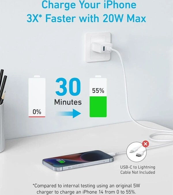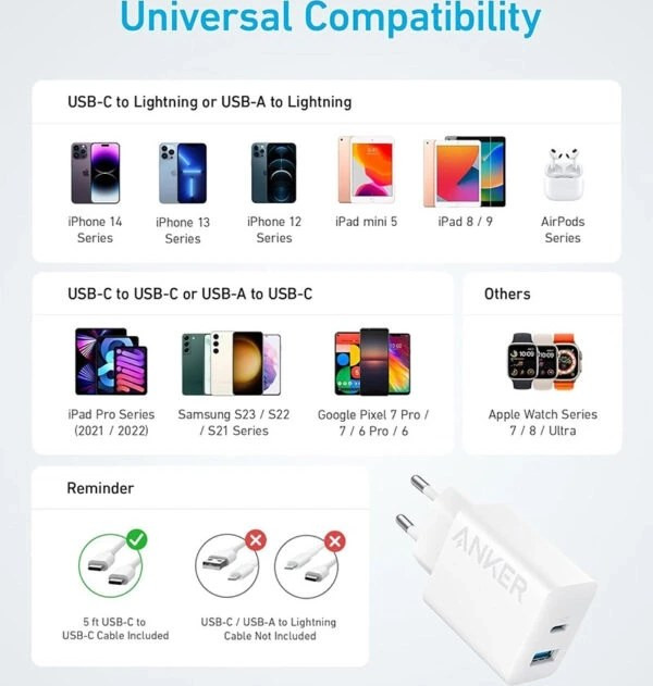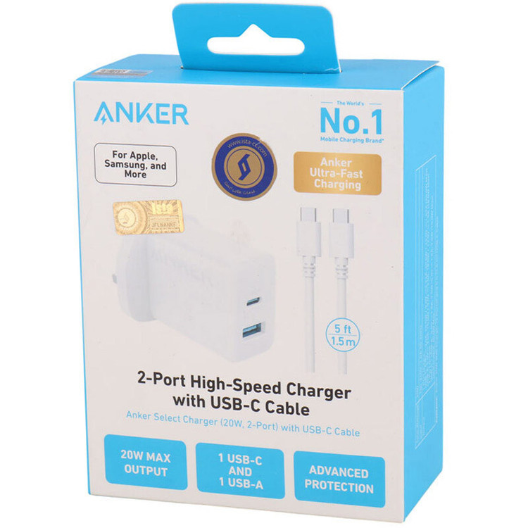 کلگی شارژ Anker مدل B2348K21 با توان خروجی 20 وات طراحی شده است. پشتیبانی از فناوری شارژ سریع PD با حداکثر توان خروجی 20 وات برای شارژ سریع انواع گوشی و تبلت. محدوده ولتاژ ورودی بین 100 الی 240 ولت با فرکانس 50 الی 60 هرتز با شدت جریان ورودی 1.0 آمپر .دارای بدنه ساخته شده از جنس پلاستیک ABS و PC مقاوم در برابر آسیب های فیزیکی همچون فشار و ضربه .مجهز به دو پورت خروجی تایپ سی و USB با حداکثر شدت جریان خروجی 3 آمپر در 5 ولت.میزان توان خروجی درگاه USB برابر با 20 وات و درگاه تایپ سی معادل 18 وات .دارای کابل تایپ سی به تایپ سی به طول 100 سانتی متری و روکش کابل پلاستیکی