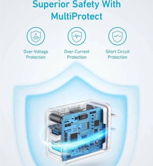 کلگی شارژ Anker مدل B2348K21 با توان خروجی 20 وات طراحی شده است. پشتیبانی از فناوری شارژ سریع PD با حداکثر توان خروجی 20 وات برای شارژ سریع انواع گوشی و تبلت. محدوده ولتاژ ورودی بین 100 الی 240 ولت با فرکانس 50 الی 60 هرتز با شدت جریان ورودی 1.0 آمپر .دارای بدنه ساخته شده از جنس پلاستیک ABS و PC مقاوم در برابر آسیب های فیزیکی همچون فشار و ضربه .مجهز به دو پورت خروجی تایپ سی و USB با حداکثر شدت جریان خروجی 3 آمپر در 5 ولت.میزان توان خروجی درگاه USB برابر با 20 وات و درگاه تایپ سی معادل 18 وات .دارای کابل تایپ سی به تایپ سی به طول 100 سانتی متری و روکش کابل پلاستیکی