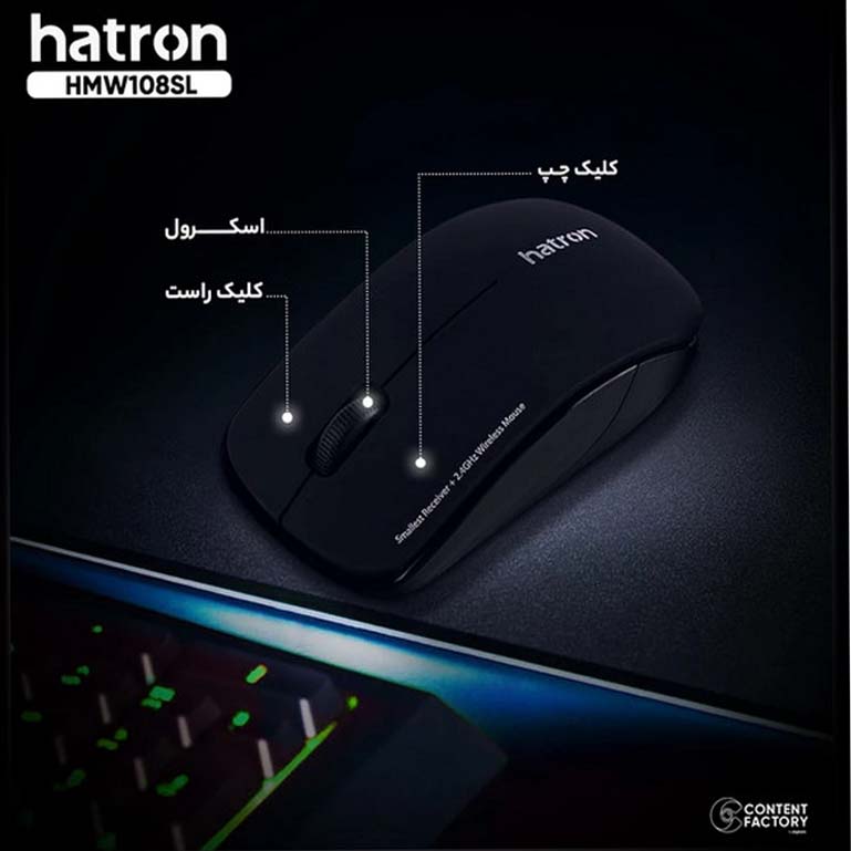 برند Hatron یکی از بهترین تولیدکنندگان موس و کیبورد و سایر لوازم جانبی در ایران است. ماوس «HMW108SL» از سری موسهای هترون است که بیصدا و بسیار خوشساخت است. این ماوس دارای 3 کلید بوده و نوع اتصال آن به سیستم از طریق دانگل مخصوص می باشد. طراحی ارگونومیک زیبا و شیک این ماوس برای استفاده طولانیمدت طراحی شده است که از فشار بیمورد بر دست جلوگیری میکند و بهراحتی در دست قرار میگیرد. ماوس HMW108SL دارای دقتDPI1200 است. فرکانس کاری این ماوس(و دانگلش) برابر 2٫4 گیگاهرتز است و تا 10 متر مسافت را پشتیبانی میکند. بهاینترتیب برای کنترل سیستم کامپیوتری خود، محدود به میز کار نبوده و بهراحتی از فاصله دور هم قادر به انجام کارهای کامپیوتری خود هستید. انرژی موردنیاز این ماوس از طریق یک عدد باتریقلمی AA تامین میشود.ویژگی بارز این مدل قابلیت Auto Power است که سبب صرفه جویی در مصرف باتری و طول عمر آن می شود. این ماوس با تمامی سیستمعاملهای رایج سازگاری دارد. طراحی آن مینیمال و ساده، و برای سیستمهای خانگی، اداری و بانکها انتخاب مناسبی به شمار میآید و توانسته در بین کاربران سیستمهای کامپیوتری توجه بسیاری از افراد را جلب کند.