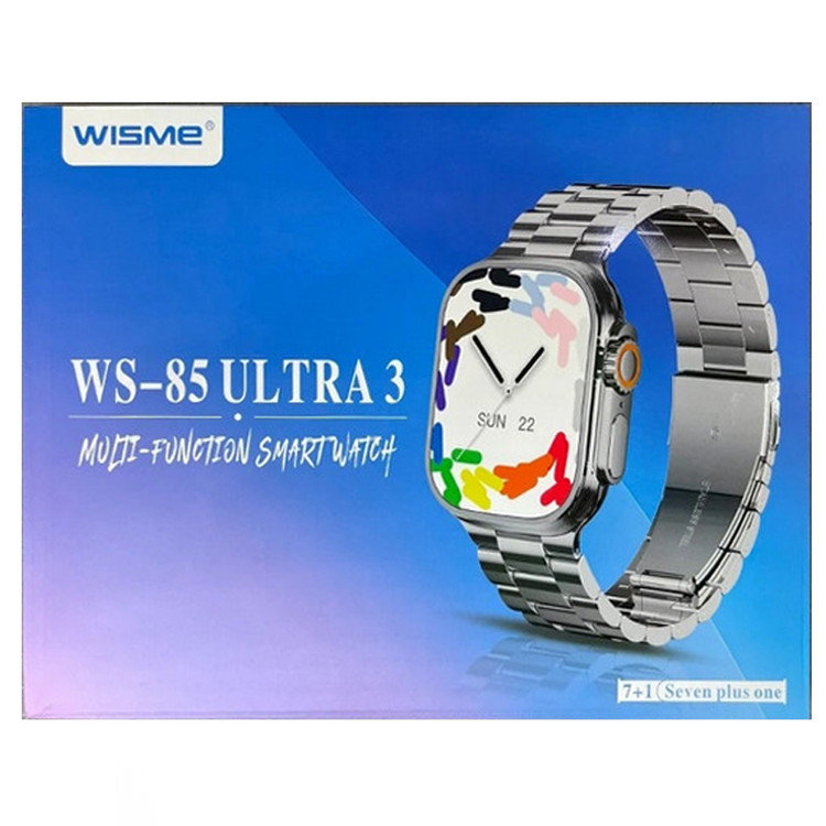 ساعت هوشمند Wisme مدل WS-85 Ultra3 با بدنه فلزی و سایز قاب 49 میلیمتر، دارای صفحهنمایش لمسی رنگی ~2.0 اینچ مستطیلی، مقاومت در برابر پاشش آب با استاندارد IP65، مجهز به 7 بند سیلیکونی و فلزی قابل تعویض، قابلیت مکالمه بلوتوثی با میکروفون و اسپیکر، اتصال از طریق بلوتوث 5.0 و 3.0 سازگار با اندروید و iOS، پشتیبانی کامل از زبان فارسی در منو و اعلانها، دارای سنسورهای سلامتی شامل ضربان قلب، فشار خون، اکسیژن خون، نوار قلب (ECG) و پایش خواب، امکاناتی نظیر کنترل موسیقی و دوربین، دستیار صوتی، Dynamic Island، ماشینحساب و واچفیسهای متنوع، باتری 320 میلیآمپر با شارژ وایرلس و شارژدهی تا 15 روز، به همراه 7 بند و شارژر وایرلسی ارائه میشود.