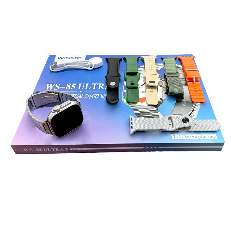 ساعت هوشمند Wisme مدل WS-85 Ultra3 با بدنه فلزی و سایز قاب 49 میلیمتر، دارای صفحهنمایش لمسی رنگی ~2.0 اینچ مستطیلی، مقاومت در برابر پاشش آب با استاندارد IP65، مجهز به 7 بند سیلیکونی و فلزی قابل تعویض، قابلیت مکالمه بلوتوثی با میکروفون و اسپیکر، اتصال از طریق بلوتوث 5.0 و 3.0 سازگار با اندروید و iOS، پشتیبانی کامل از زبان فارسی در منو و اعلانها، دارای سنسورهای سلامتی شامل ضربان قلب، فشار خون، اکسیژن خون، نوار قلب (ECG) و پایش خواب، امکاناتی نظیر کنترل موسیقی و دوربین، دستیار صوتی، Dynamic Island، ماشینحساب و واچفیسهای متنوع، باتری 320 میلیآمپر با شارژ وایرلس و شارژدهی تا 15 روز، به همراه 7 بند و شارژر وایرلسی ارائه میشود.