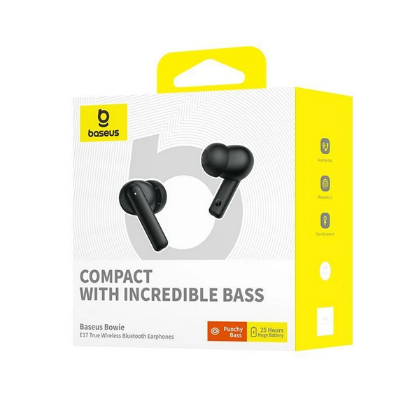 هندزفری وایرلس E17 در دو رنگ مشکی و سفیدبه بازار عرضه شده تا امکان انتخاب رنگ متناسب با سلیقهی کاربران وجود داشته باشد. ابعادی برابر با 1.5*3*3.5 سانتی متر دارد و وزن آن 37.2 گرم است. بسیار سبک هستند و بعد از قرار دادن در گوش احساس خستگی وجود نخواهد داشت.هندزفری وایرلس E17 برند بیسوس از بلوتوث نسخه 5.3 پشتیبانی می کند و می تواند به خوبی با هر دستگاهی جفت شود.بهره گیری از بلوتوث نسخه 5.3 باعث شده است انتقال داده های صوتی بین گوشی و بادزها با کمترین تاخیر ممکن صورت گیرد.ظرفیت باتری کیس 430 میلیآمپرساعت و باتری هر کدام از گوشی ها 35 میلیآمپرساعت است و توانایی نگهداری شارژ تا 25 ساعت را دارد.رگاه شارژ آن تایپ سی بوده و با استفاده از کابل شارژ موجود در بستهبندی شارژ میشود.هندزفری بلوتوثی E17 برای اتصال به گوشی همراه نیاز به بیرون آمدن از کیس را ندارد؛ فقط کافی ست در جعبه را باز کنید تا با سرعت و با زدن یک ضربه با تلفن همراه شما جفت شود.