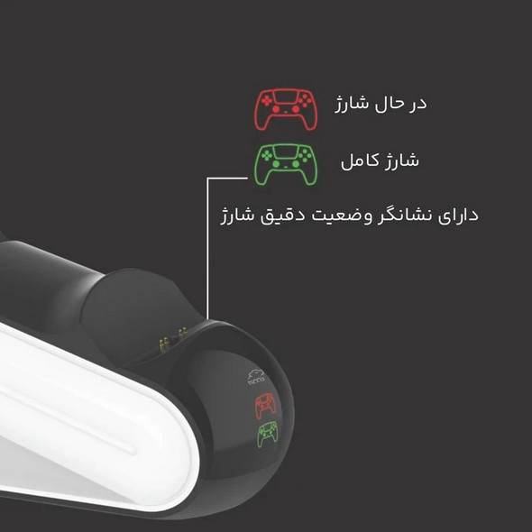 گیمرها همیشه به ابزارهایی نیاز دارند که نهتنها عملکرد بالایی داشته باشند، بلکه به ظاهر و نظم محیط بازیشان هم سرو سامان بدهند.پایه شارژر گیم پد تسکو مدل TGC 14 دقیقاً برای همین هدف ساخته شده: همزمان دو کنترلر PS5 را با سرعت بالا شارژ میکند، از شلوغی کابلها جلوگیری میکند و با ظاهر مدرنش، به زیبایی هر ستآپ گیمینگی میافزاید.پایه TGC 14 میتواند همزمان دو کنترلر PS5 را در مدت زمانی کمتر از دو ساعت شارژ کند.میتوانید شارژر را مستقیماً به کنسول، لپتاپ یا آداپتور دیواری متصل کنید و بازده کامل را دریافت کنید.در TGC 14 با یک پورت Type-C واقعی مواجه هستیم که خروجی 5.1 ولت و 0.85 آمپر برای هر پورت را پشتیبانی میکند.این یعنی اگر مشغول بازی دو نفره هستید یا یکی از کنترلرها را برای مهمان کنار گذاشتهاید، هیچ وقت با پیغام “Low Battery” وسط بازی مواجه نمیشوید.در قسمت اتصال کنترلرها، از پینهای فنری با طراحی Pogopin استفاده شده؛ یعنی بدون نیاز به فشار یا دقت زیاد، فقط کافیست کنترلر را روی پایه بگذارید تا اتصال برقرار شود.محدود به یک پورت خاص نیستید. پایه شارژر را میتوانید از طریق USB به کنسول PS5، رایانه شخصی یا حتی آداپتور موبایل وصل کنید.همین انعطاف، استفاده از TGC 14 را هم در خانه و هم در سفر راحتتر میکند و آزادی عمل بیشتری به شما میدهد.با وجود سه رنگ قرمز، سبز و سفید در چراغ LED، وضعیت شارژ هر کنترلر بهراحتی قابل تشخیص است.قرمز یعنی در حال شارژ، سبز یعنی شارژ کامل، و سفید یعنی اتصال برقرار است اما هنوز فرآیند آغاز نشده.نیازی به حدس یا قطع و وصل نیست؛ فقط کافیست یک نگاه به چراغ بیندازید تا همهچیز را بفهمید.