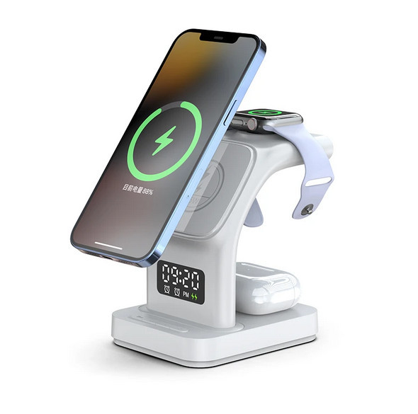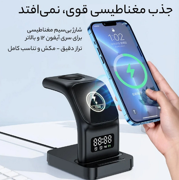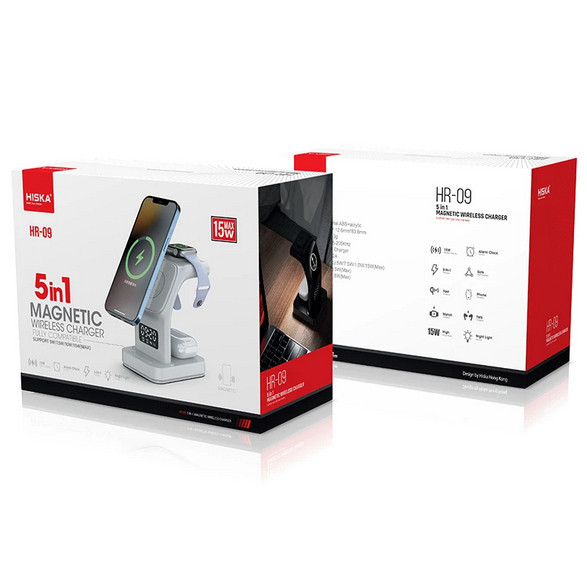 با شارژر بی سیم هیسکا مدل HR-09 یک محصول خریداری میکنید، اما در اصل 5 محصول مختلف دریافت میکنید.فقط کافی است که شارژر را بهوسیله یک کابل USB به برق متصل کنید و همزمان با شارژ گوشی موبایل، ساعت هوشمند و هدفون بیسیم تان، چندین زنگ هشدار تنظیم کنید.شما میتوانید گوشی موبایل خود را با حداکثر با برق خروجی 15 وات بهراحتی و بیسیم شارژ کنید. این محصول قابلیت شارژ گوشی به صورت عمودی وجود دارد؛ همزمان گوشی خود را بهصورت عمودی شارژ کرده و از آن استفاده کنید ودر عینحال از تماشای ویدیو، تماسهای تصویری و یا بازی خود لذت ببرید.برق خروجی برای ساعت هوشمند حداکثر 2 وات و برای هدفون بیسیم حداکثر 5 وات است. از دیگر قابلیتهای محصول، داشتن چراغ خواب و ساعت دیجیتال است که به وسیله دکمه هایی که پایین محصول قرار دارند میتوانید چراغ خواب را روشن و خاموش و همچنین ساعت دیجیتال را تنظیم کنید.