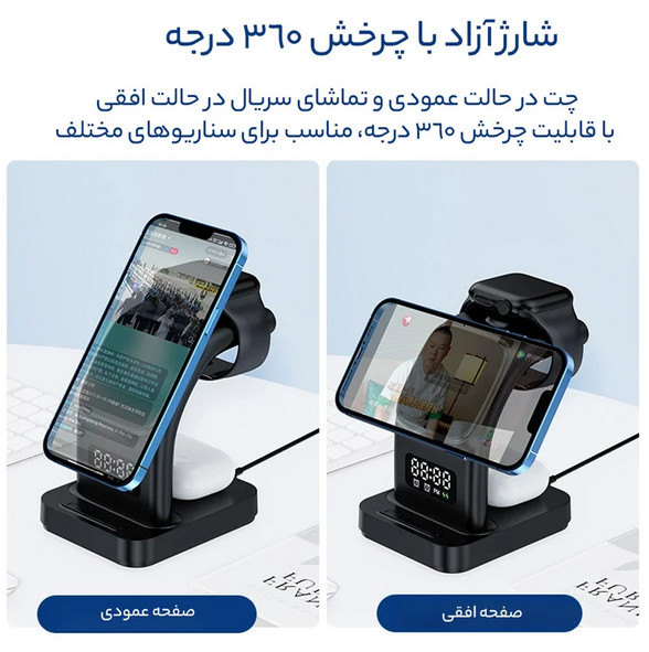 با شارژر بی سیم هیسکا مدل HR-09 یک محصول خریداری میکنید، اما در اصل 5 محصول مختلف دریافت میکنید.فقط کافی است که شارژر را بهوسیله یک کابل USB به برق متصل کنید و همزمان با شارژ گوشی موبایل، ساعت هوشمند و هدفون بیسیم تان، چندین زنگ هشدار تنظیم کنید.شما میتوانید گوشی موبایل خود را با حداکثر با برق خروجی 15 وات بهراحتی و بیسیم شارژ کنید. این محصول قابلیت شارژ گوشی به صورت عمودی وجود دارد؛ همزمان گوشی خود را بهصورت عمودی شارژ کرده و از آن استفاده کنید ودر عینحال از تماشای ویدیو، تماسهای تصویری و یا بازی خود لذت ببرید.برق خروجی برای ساعت هوشمند حداکثر 2 وات و برای هدفون بیسیم حداکثر 5 وات است. از دیگر قابلیتهای محصول، داشتن چراغ خواب و ساعت دیجیتال است که به وسیله دکمه هایی که پایین محصول قرار دارند میتوانید چراغ خواب را روشن و خاموش و همچنین ساعت دیجیتال را تنظیم کنید.