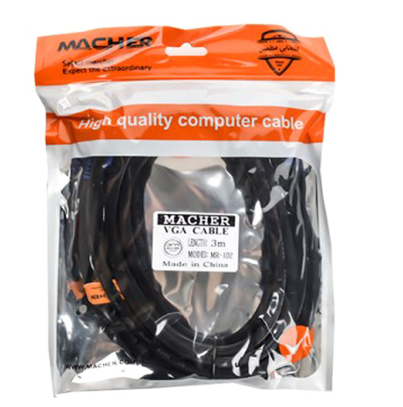 کابل VGA MACHER با طول 3 متر مناسب برای اتصال کارت گرافیک به مانیتور است که بهترین کیفیت تصویر را ارائه می دهد.این محصول با داشتن 15 پین استاندارد انتقال تصویر را به خوبی انجام می دهد و کانکتور فلزی سر سوکت ها مقاوم بالایی در برابر آسیب را ایجاد می کند.همچنین پوشش رویه ی کابل از جنس PVC است که باعث بالا رفتن عمر کابل می شود.