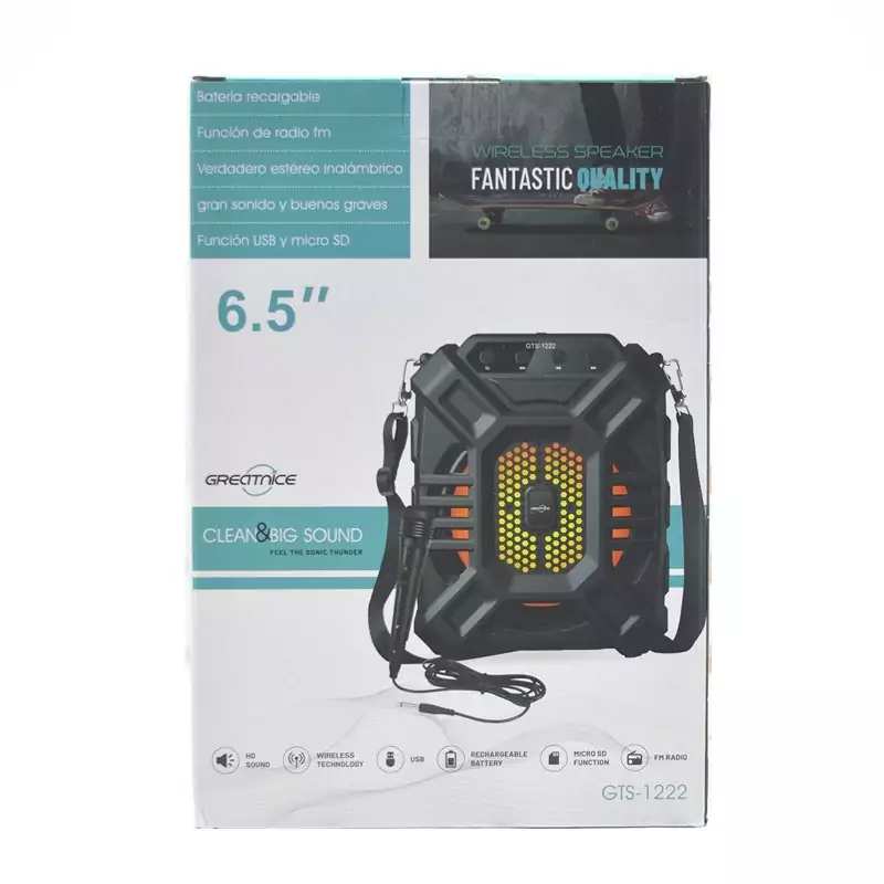 اسپیکر بلوتوثی قابلحمل مدل KTX-1222 محصولی است که با توجه به ساختار، صدای خروجی و البته قیمت، نمیتوان به راحتی از کنار آن گذشت. اسپیکری که سعی دارد تا با توجه به رده اقتصادی خود، لبخند رضایت را روی لب خریداران بنشاند. در بخش ظاهری اسپیکر بلوتوثی قابلحمل مدل KTX-1222 شاهد یک طراحی عام پسند هستیم به این معنی که قطعاً کاربران خاص نگاهی متفاوت به محصولات دارند. پشت بدنه اسپیکر هم حفرهای قرار گرفته تا دستگیرهای باشد برای حمل آسان تر بدون بند. در مجموع طراحی این اسپیکر قابل قبول است اما با توجه به سطح بودجهای که برای آن در نظر گرفته شده است، نباید در بخش متریال استفاده شده انتظار زیادی از آن داشت. در جعبه این اسپیکر بجز، خود محصول شاهد میکروفن، کابل شارژ و بند حمل هستیم.