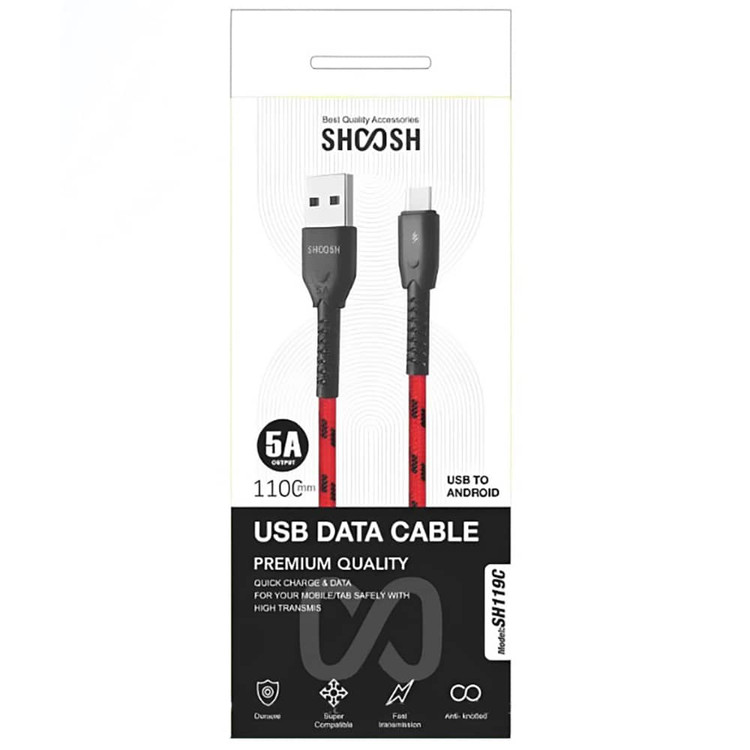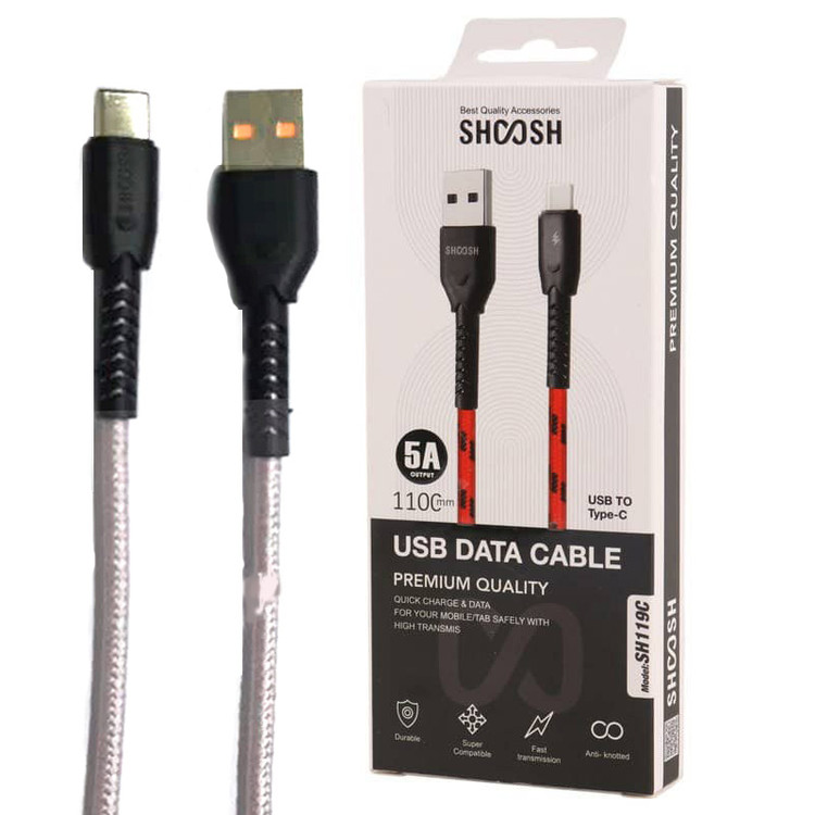 کابل شارژ تایپ سی شوش SHOOSH SH-119C 5A 110CM برای دستگاه هایی که مجهز به پورت تایپ سی به خصوص گوشی های شیائومی مناسب است. شدت جریان عبوری در کابل تایپ سی شوش مدل SHOOSH SH119C مقدار 5 آمپر است دارای سرعت انتقال داده بالایی است.به طور کلی کابل فست شارژ تایپ سی SHOOSH SH119C از کانتکتورهای بسیار مقاوم برخوردارند که همین امر مانع از خوردگی و زنگ زدگی آن می شود.جنس این کابل تایپ سی از PVC بوده و در چند رنگ چذاب به بازار عرضه شده است. طول آن 110 سانتی متر است .