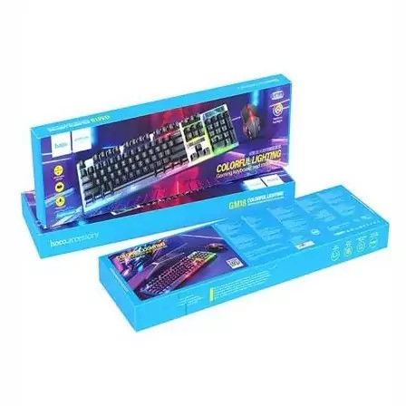 موس GM18 از طراحی ارگونومیک برخوردار است و به گونهای طراحی شده است که به راحتی در دست قرار میگیرد و از خستگی دست در حین استفاده طولانی مدت جلوگیری میکند . بدنه موس از پلاستیک فشرده ABS ساخته شده است و از استحکام بالایی برخوردار می باشد . موس GM18 از یک حسگر اپتیکال بهره میبرد که دقت بسیار بالایی دارد . این حسگر میتواند سرعت حرکت موس را تا 200 اینچ بر ثانیه و دقت آن را تا 1200 DPI تشخیص دهد . موس GM18 دارای چهار کلید اصلی است که برای کنترل حرکت موس استفاده میشوند . همچنین ، این موس دارای یک کلید DPI است که با استفاده از آن میتوان دقت موس را بین سه حالت 1200 ، 1000 و 800 DPI تغییر داد کیبورد GM18 از طراحی ارگونومیک برخوردار است و دارای کلیدهایی با ابعاد بزرگ و فاصله مناسب است . این طراحی باعث میشود تا کاربر بتواند به راحتی و بدون خستگی از کیبورد استفاده کند . کیبورد GM18 دارای 104 کلید است که این کلیدها از کیفیت بالایی برخوردار هستند و عمر ضربهپذیری بالایی دارند . کیبورد GM18 دارای نورپردازی RGB می باشد . همچنین ، این کیبورد دارای کلیدهای میانبر مولتی مدیا است که دسترسی به کنترلهای صوتی و رسانهای را آسان میکند .
