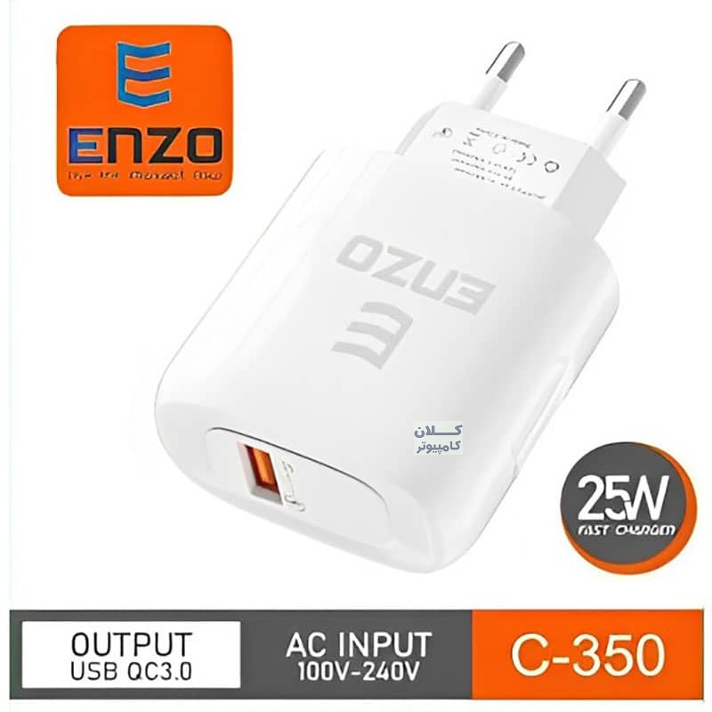 شارژر انزو مدل C-350 دارای پورت خروجی USB با توان خروجی 25 وات بوده که ولتاژ ورودی آن 100 الی 240 ولت می باشد. مجهز به فناوری شارژ سریع با توان خروجی 25 وات و جنس بدنه ساخته شده از پلاستیک بادوام مقاوم در برابر آسیب های فیزیکی و سازگار با انواع دستگاههای هوشمند نظیر گوشی های هوشمند و تبلت می باشد. داخل جعبه این شارژر یک عدد کابل شارژر از نوع تایپ سی قرار داده شده است.