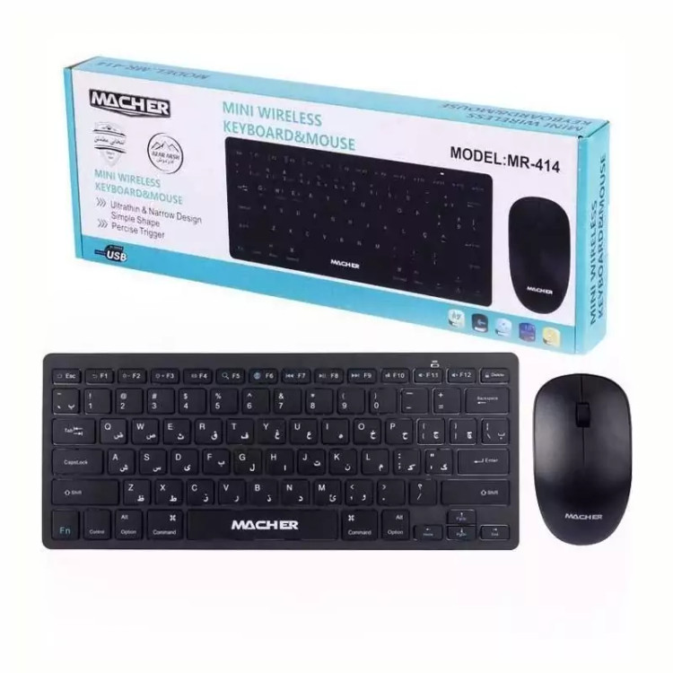 ست کیبورد و ماوس بی سیم مچر مدل MR-414 بهره مند از یک نشانگر LED جهت آگاهی از وضعیت شارژ باتری موفق به کسب استاندارد های سلامت فیزیکی محصول CE و RoHS کیبورد دارای 78 عدد کلید فیزیکی با حروف فارسی حک شده بر روی آن طراحی شده به صورت ارگونومیک جهت جلوگیری از خستگی دست کاربر منبع تغذیه کیبورد یک عدد باتری AA، منبع تغذیه موس یک عدد باتری AA نحوه اتصال ماوس و کیبورد به سیستم توسط دانگل USB به صورت بی سیم بدنه ساخته شده از متریال پلاستیک با کیفیت، مقاوم در برابر فشار و ضربه احتمالی موس شامل 3 کلید، مجهز به حسگر از نوع اپتیکال، فرکانس بی سیم موس 2٫4 گیگاهرتز