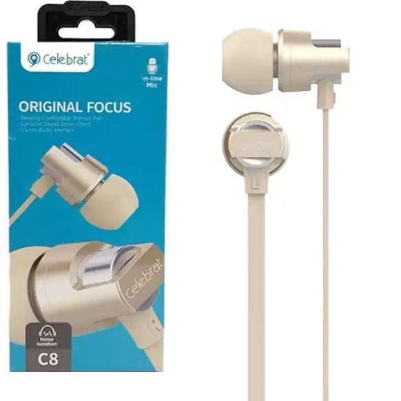 هندزفری اصلی سیم دار سلبریت Celebrat C8 دارای کیفیت صدای شفاف و بینظیر مناسب جهت استفاده روزمره ، پیاده روی ، گیمینگ و ورزش میباشد که در رنگ های متنوعی تولید شده است هندزفری سلبریت C8 دارای میکروفون با کیفیت جهت برقراری تماس دارد و همچنین برای سهلوت استفاده کلید پاسخ و قطع کردن تماس در کنار میکروفون تعبیه شده است. رابط جک هندزفری 3.5 میلیمتری آن سازگار با انواع دیوایس ها مانند گوشی موبایل ، تبلت ، لپتاپ ، Mp3 و غیره میباشد. سیم و کابل هندزفری از نوع فلت یا تخت میباشد و از متریال با کیفیت ساخته شده که در برابر کشش و پارگی مقاوم است. طول سیم هندزفری سلبریت 120 سانتی متر میباشد.