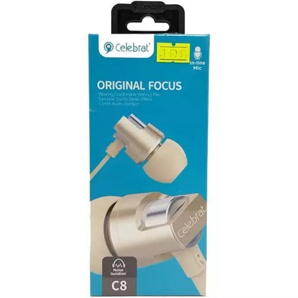 هندزفری اصلی سیم دار سلبریت Celebrat C8 دارای کیفیت صدای شفاف و بینظیر مناسب جهت استفاده روزمره ، پیاده روی ، گیمینگ و ورزش میباشد که در رنگ های متنوعی تولید شده است هندزفری سلبریت C8 دارای میکروفون با کیفیت جهت برقراری تماس دارد و همچنین برای سهلوت استفاده کلید پاسخ و قطع کردن تماس در کنار میکروفون تعبیه شده است. رابط جک هندزفری 3.5 میلیمتری آن سازگار با انواع دیوایس ها مانند گوشی موبایل ، تبلت ، لپتاپ ، Mp3 و غیره میباشد. سیم و کابل هندزفری از نوع فلت یا تخت میباشد و از متریال با کیفیت ساخته شده که در برابر کشش و پارگی مقاوم است. طول سیم هندزفری سلبریت 120 سانتی متر میباشد.