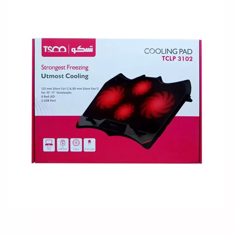 لپ تاپ ها با وجود نرم افزار های سنگین و رندر های شدید دچار گرما زدگی می شوند،در چنین وضعیتی وجود یک پایه خنک کننده(کول پد) ضروری است.پایه خنک کننده تسکو مدل TCLP 3102 با 4 عدد فن قدرتمند و با دور چرخش بالایی که دارد،برای انواع لپ تاپ ها با سایز های 17-10 اینچی مناسب است.به وسیله کابل USB همراهش به لپ تاپ شما وصل شده و همچنین دارای بیش از 8 عدد نشانگر LED می باشد و جنس بدنه آن ترکیبی از فلز و پلاستیک است.