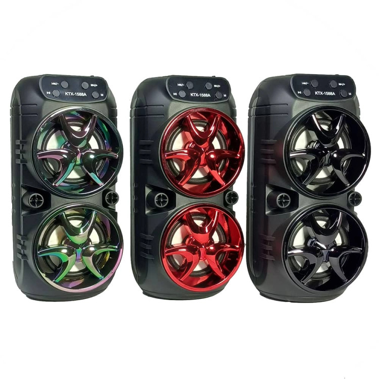 اسپیکر مدل KTX-1589-B با داشتن دو بلندگوی 4 اینچی با ابعاد 13.7x13.5x30.3 سانتی متر ، یک پرتابل اسپیکر با وضوح صدای مناسب برای مکانهای کوچک است که با ابعاد و وزن مناسبی که دارد قابلیت جابجایی راحت و استفاده در مکان های مختلف را برای شما فراهم میکند تا بتوانید از طریق بلوتوث / مموری کارت و یا فلش موزیک دلخواهتان را اجرا کنید و از شنیدن صدای آن لذت ببرید. داخل هر دو باند این اسپیکر چراغهای LED رنگی قرار دارد که زیبایی بیشتری به این اسپیکر می بخشد. باطری 1200 میلی آمپر اسپیکر تا بیش از یکساعت پخش موزیک با صدای بلند را برای شما فراهم میکند و برای شارژ کامل باطری 2 ساعت زمان نیاز دارد. این اسپیکر رادیو FM هم دارد که به کمک دکمه ها باید موجهای رادیو بصورت خودکار فعال شود. اما جذاب ترین قابلیت این اسپیکر اتصال دو اسپیکر مدل KTX-1589B به یکدیگر است ، هر دو اسپیکر را روشن و روی مدل بلوتوث قرار دهید ، دکمه M روی یکی از اسگیکرها را دو ثانیه نگهدارید تا صدای بوق را بشنوید ، حالا بلوتوث گوشی را به آن متصل کنید ، میبینید که صدای موزیک از هر دو اسپیکر پخش میشود و حالا شما از 4 باند 4 اینچ برای شنیدن موزیک دلخواهتان لذت میبرید.