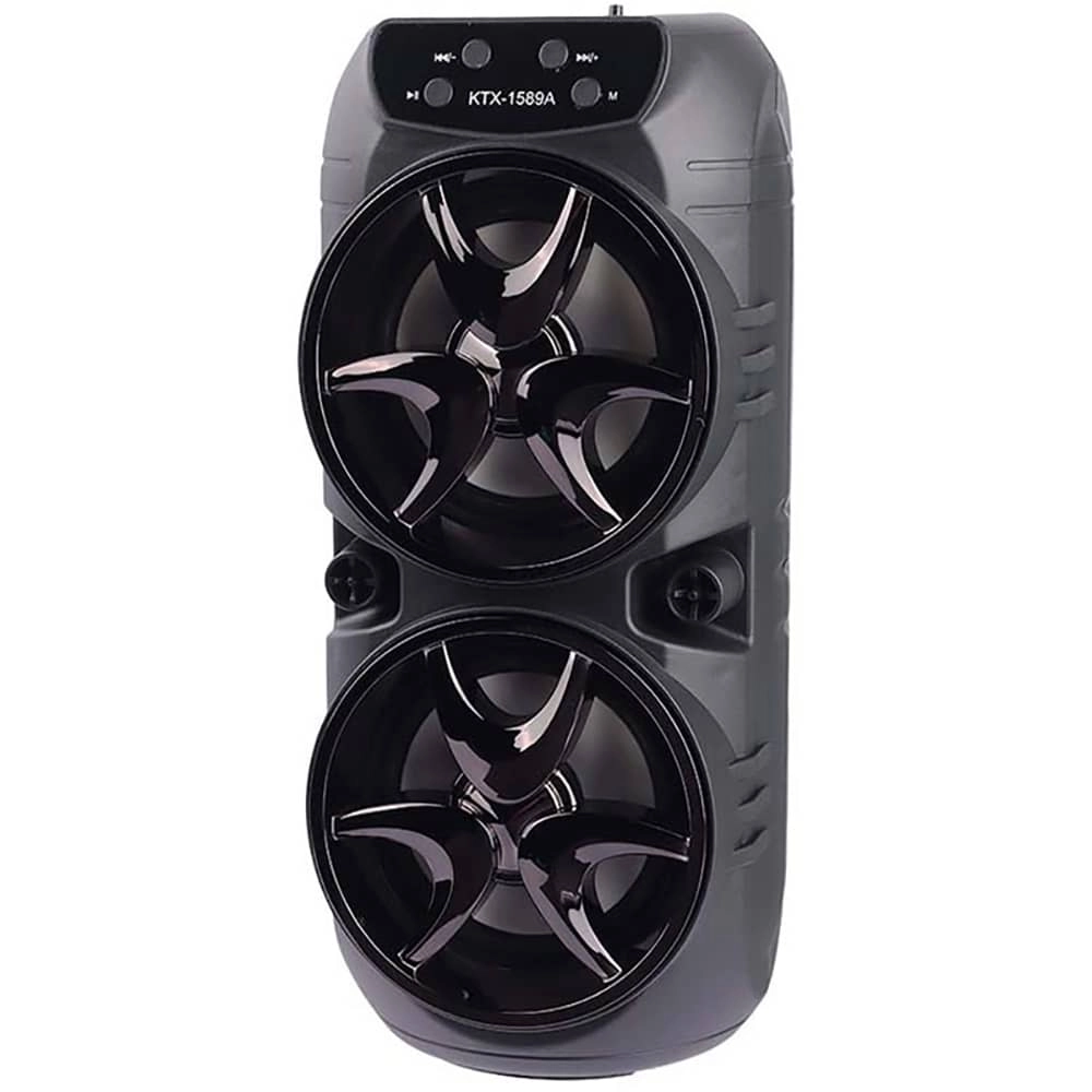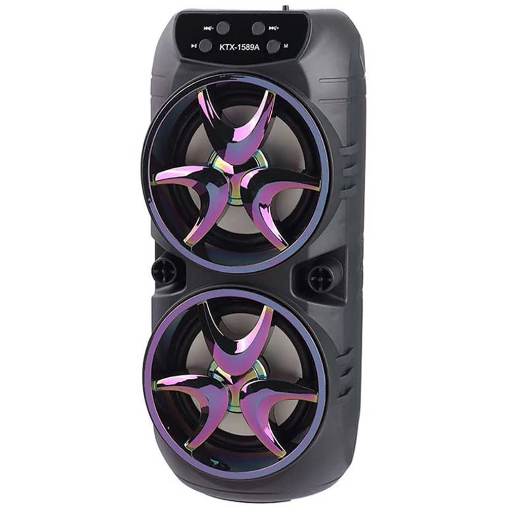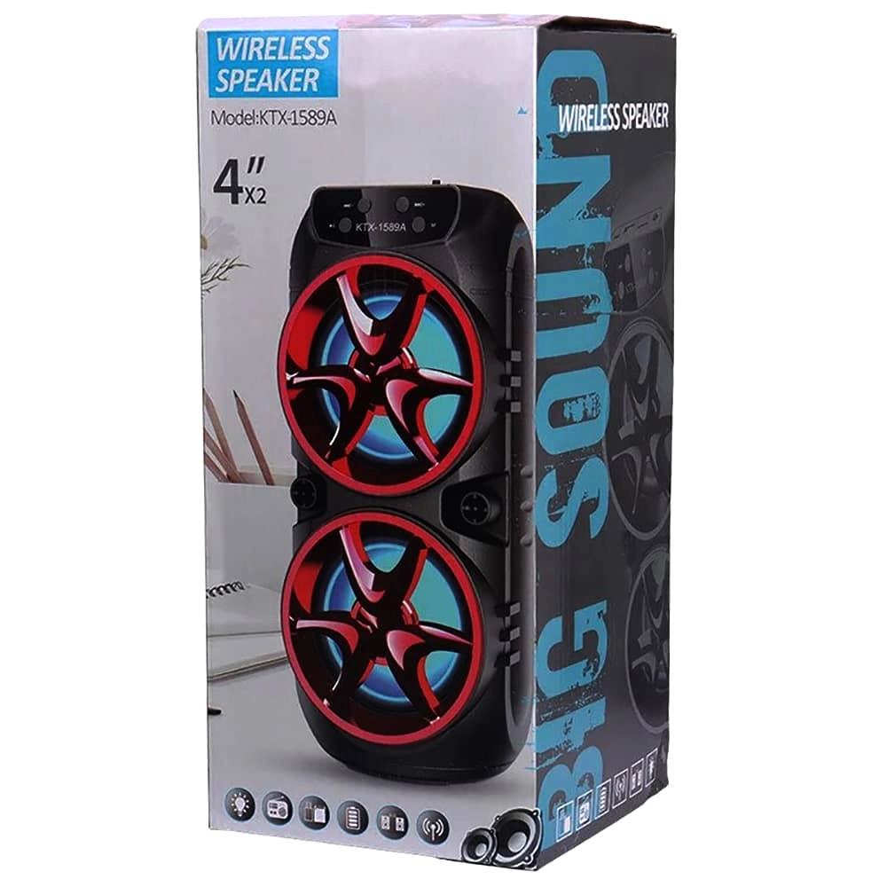 اسپیکر مدل KTX-1589-B با داشتن دو بلندگوی 4 اینچی با ابعاد 13.7x13.5x30.3 سانتی متر ، یک پرتابل اسپیکر با وضوح صدای مناسب برای مکانهای کوچک است که با ابعاد و وزن مناسبی که دارد قابلیت جابجایی راحت و استفاده در مکان های مختلف را برای شما فراهم میکند تا بتوانید از طریق بلوتوث / مموری کارت و یا فلش موزیک دلخواهتان را اجرا کنید و از شنیدن صدای آن لذت ببرید. داخل هر دو باند این اسپیکر چراغهای LED رنگی قرار دارد که زیبایی بیشتری به این اسپیکر می بخشد. باطری 1200 میلی آمپر اسپیکر تا بیش از یکساعت پخش موزیک با صدای بلند را برای شما فراهم میکند و برای شارژ کامل باطری 2 ساعت زمان نیاز دارد. این اسپیکر رادیو FM هم دارد که به کمک دکمه ها باید موجهای رادیو بصورت خودکار فعال شود. اما جذاب ترین قابلیت این اسپیکر اتصال دو اسپیکر مدل KTX-1589B به یکدیگر است ، هر دو اسپیکر را روشن و روی مدل بلوتوث قرار دهید ، دکمه M روی یکی از اسگیکرها را دو ثانیه نگهدارید تا صدای بوق را بشنوید ، حالا بلوتوث گوشی را به آن متصل کنید ، میبینید که صدای موزیک از هر دو اسپیکر پخش میشود و حالا شما از 4 باند 4 اینچ برای شنیدن موزیک دلخواهتان لذت میبرید.