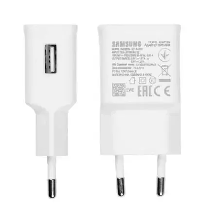 شارژر اصلی Galaxy S10 دارای آداپتور دو پین با درگاه خروجی یو اس بی می باشد،