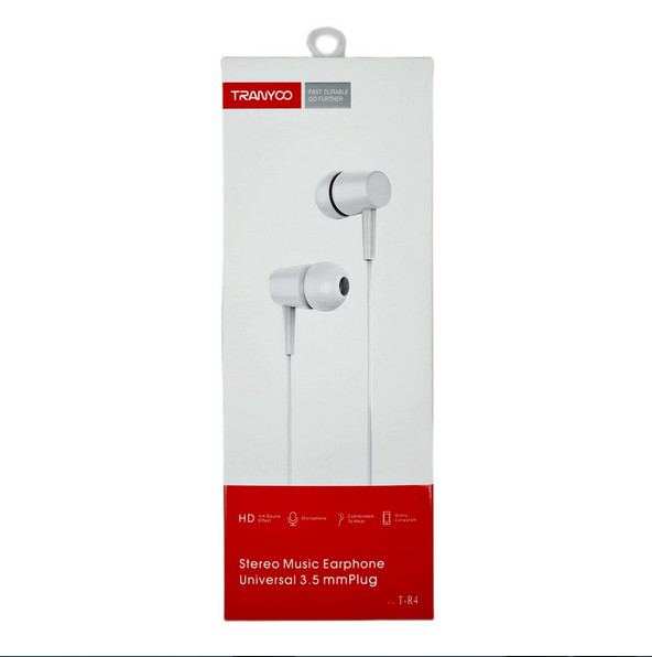 هندزفری سیم دار ترانیو (Tranyoo) مدل T-R4 که جزو هدفونهای توگوشی یا ایرفون (Earphone) بهشمار میرود. به منظور استفاده از این محصول کافی است جک ایرفون 3.5 میلیمتری آن را به گوشی هوشمند خود متصل کرده و از تجربه گوش دادن به موسیقی لذت ببرید؛ با استفاده از این محصول به راحتی میتوانید به تماسهای تلفنی خود پاسخ دهید و همچنین با استفاده از طول کابل 1.2 متری این محصول، استفاده از آن آسانتر شده و میتوانید به راحتی گوشی موبایل خود را درون جیب و یا کیف خود قرار دهید.