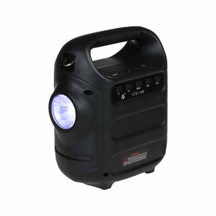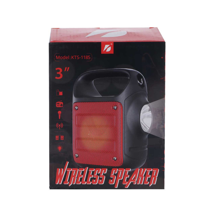 اسپیکر قابل حمل KTS-1185 مجهز به چراغ LED قوی دارای سه حالت زیاد- متوسط و چشمک زن میباشد که از این اسپیکر قابل حمل میتوان به عنوان چراغ شارژی نیز استفاده نمود ، این اسپیکر دارای باند خروجی به قطر سه اینچ و توان 5 وات با کیفیت صدای بسیار مناسب میباشد.با این اسپیکر میتوان از طريق فناوري بلوتوث به تلفنهمراه يا پخشکنندهي صوتي متصل شد. در قسمت بالایی اسپيکر يک درگاه USB و يک درگاه کارت حافظه به چشم ميخورد که از طريق آنها نيز میتوانید موسيقي دلخواهتان را گوش دهيد .این اسپیکر توانایی پشتیبانی از کارت حافظه و USB با ظرفیت 32 گیگا بایت را دارد. از ويژگي هاي ديگر اين اسپيکر ميتوان به راديو FM و ورودی میکروفون اشاره کرد. این اسپیکر دارای باطری قابل شارژ نیز میباشد. وجود نور با چندین رنگ متفاوت در قسمت جلویی اسپیکر، زیبایی خاصی را ایجاد نموده است .