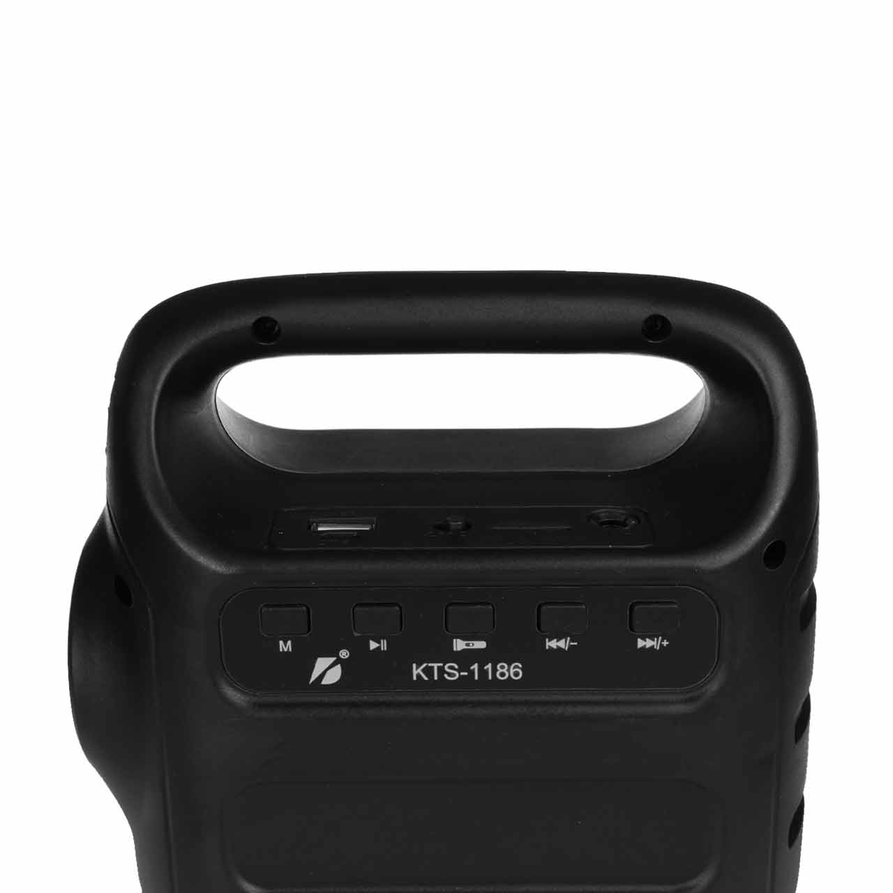 اسپیکر قابل حمل KTS-1185 مجهز به چراغ LED قوی دارای سه حالت زیاد- متوسط و چشمک زن میباشد که از این اسپیکر قابل حمل میتوان به عنوان چراغ شارژی نیز استفاده نمود ، این اسپیکر دارای باند خروجی به قطر سه اینچ و توان 5 وات با کیفیت صدای بسیار مناسب میباشد.با این اسپیکر میتوان از طريق فناوري بلوتوث به تلفنهمراه يا پخشکنندهي صوتي متصل شد. در قسمت بالایی اسپيکر يک درگاه USB و يک درگاه کارت حافظه به چشم ميخورد که از طريق آنها نيز میتوانید موسيقي دلخواهتان را گوش دهيد .این اسپیکر توانایی پشتیبانی از کارت حافظه و USB با ظرفیت 32 گیگا بایت را دارد. از ويژگي هاي ديگر اين اسپيکر ميتوان به راديو FM و ورودی میکروفون اشاره کرد. این اسپیکر دارای باطری قابل شارژ نیز میباشد. وجود نور با چندین رنگ متفاوت در قسمت جلویی اسپیکر، زیبایی خاصی را ایجاد نموده است .