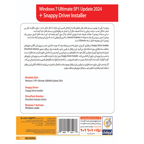 این محصول شامل آخرین نسخه از ویندوز 7 سرویس پک 1 آپدیت 2024 گردو در ویرایشهای 32 و 64 بیتی با اتوران اختصاصی گردو به همراه راهنمای نصب فارسی است. همچنین در این محصول، آخرین نسخه از نرم افزار Snappy Driver Installer جهت شناسایی و نصب خودکار درایورهای سخت افزاری بر روی ویندوز 7 قرار داده شده است.