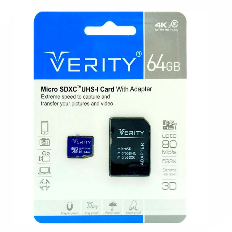 کارت حافظه Verity با استفاده از جدیدترین تکنولوژی های روز و با استاندارد UHS-I U1 طراحی و تولید شده است. این کارت حافظه کمپانی وریتی توانایی انتقال اطلاعات را تا حداکثر سرعت 80 مگابایت بر ثانیه را داراست و مناسب برای ضبط ویدئو با کیفیت Full HD و 4k می باشد. این محصول به دلیل داشتن یک آداپتور علاوه بر انواع گوشی ها ، تبلت ها مناسب دوربین های دیجیتال، دوربین های فیلمبرداری نیز است. کارت حافظه Verity UHS-I C10 U1 533X 80MBps از نوع کلاس 10 بوده و دارای استانداردهای سرعت U1 و UHS-I نیز می باشد؛ بعلاوه رم میکرو 64 گیگ وریتی Verity U1 80MB در برابرشوک و ضربه، رطوبت، اشعه ایکس (گیت های بازرسی) و مجاورت با آهنربا مقاومت مناسبی دارد.