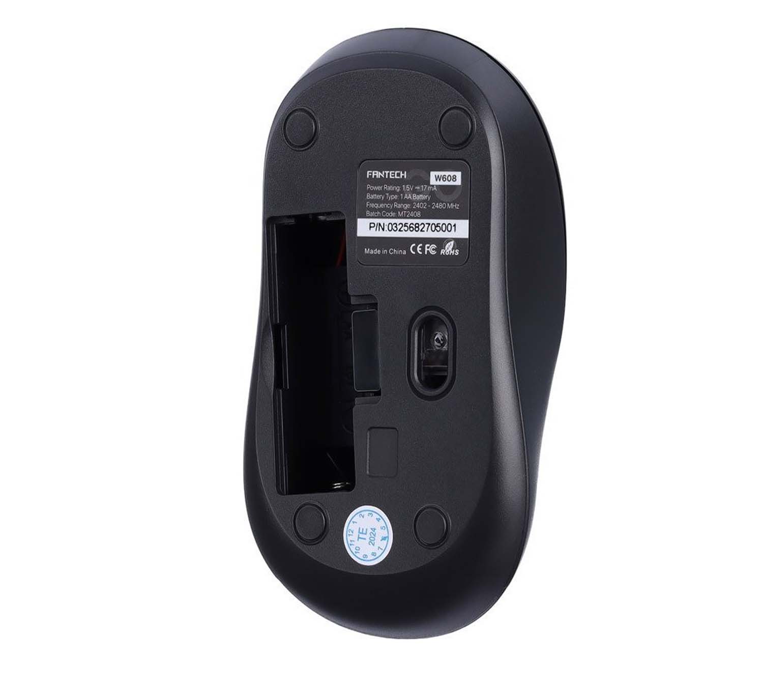 ماوس بیسیم فنتک مدل W608 با 3 کلید دارای قابلیت اتصال به وسیلهی دانگل USB 2.4 گیگاهرتز است. ماوس وایرلس فنتک مدل W608 با محدوده عملکرد 10 متر از کیفیت بسیار بالایی برخوردار است. همچنین علاوه بر قابلیت انتقال و عملکرد سریع، با 3 میلیون بار کلیک از طول عمر خوبی برخوردار است. این ماوس بیسیم دارای قابلیت تنظیم دقت تا بیش از 1200 DPI میباشد که برای کاربران میزان مناسبی است.از ویژگیهای ظاهری این ماوس میتوان به طراحی مات و جنس بدنهی آن اشاره کرد که از پلاستیک ABS ساخته شده است. تفاوت این نوع پلاستیک با پلاستیک معمولی در خاصیت ضد اشتعال آن میباشد. این کالا با رنگ مشکی در اختیار کاربران قرار گرفته است. همچنین ابعاد این ماوس 105*53*38 و وزن آن نیز 50 گرم میباشد.همانطور که قبلتر اشاره شد این ماوس دارای قابلیت اتصال از طریق دانگل USB است و با باتری قلمی کار میکند. از اقلام همراه این کالای وایرلس نیز میتوان به دفترچه راهنما اشاره کرد. همچنین ولتاژ و جریان بکار رفته در این محصول به ترتیب 1.5 ولت و 17 میلیآمپر است.